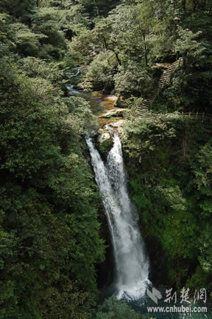 參觀完兩處紅色旅游景點(diǎn)之后,記者們順道觀光了龍?zhí)讹L(fēng)景區(qū)。龍?zhí)段挥诖钠何鞅逼吖,是近年來開發(fā)的以自然與人文景觀相結(jié)合的旅游風(fēng)景區(qū)。據(jù)介紹,當(dāng)?shù)氐奈迳窈邮驱執(zhí)丁拔逄妒似佟钡脑慈。溪水沖擊小井峽谷后,陡然跌落絕壁之下,又連續(xù)飛下四級斷崖,形成梯狀的五個氣勢磅礴的瀑布和深潭,這就是碧玉、金鎖、珍珠、飛鳳、玉女等五潭五瀑。細(xì)察五潭,碧水泱泱,樹影幢幢,崖壁如刀削斧鑿,崖腳怪石,汀芷競秀,綠蔭覆蓋四周。仰觀五瀑,潭潭無俗水,瀑瀑似神女。