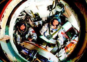 神六即將發(fā)射,宇航員正在進行緊張訓(xùn)練。