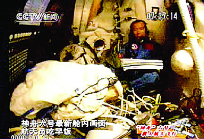 航天員在飛船內(nèi)吃早飯