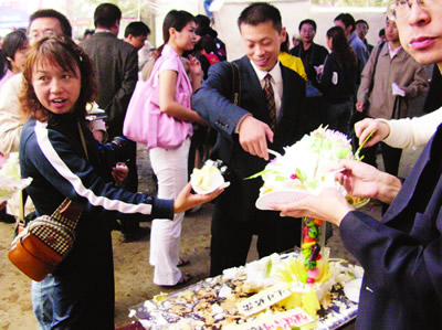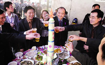 工作人員忙碌地張羅著。記者還發(fā)現(xiàn),在聶家新房前,新壘起了一個(gè)大磚灶,上面架一口大鐵鍋,鍋內(nèi)熱氣騰騰。經(jīng)打聽得知,因擔(dān)心前來道賀的親友眾多,工作人員特意向當(dāng)?shù)貜N師借來一口大鍋,用于煮長(zhǎng)壽面。因鍋實(shí)在是太大,聶家沒有相應(yīng)的灶能架住,于是人們?cè)谇叭瞻頃r(shí)分,臨時(shí)壘了這座灶臺(tái)。慶祝儀式結(jié)束后,記者上前打聽一共向這口大鍋里下了多少面條。兩名幫忙的鄉(xiāng)親說:“我們不停地在下面條,已經(jīng)記不清到底下了多少了!”他們還告訴記者,在當(dāng)?shù)兀昭缛绱寺≈,天南海北的人如此眾多,如此受到關(guān)注,在楊垱鎮(zhèn)甚至在整個(gè)襄樊市“都應(yīng)該是第一次”。