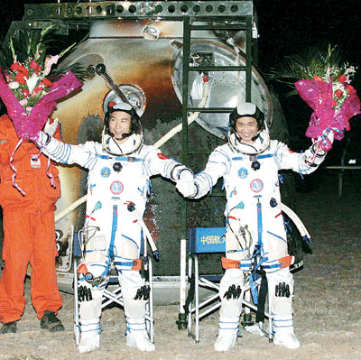轉(zhuǎn)眼之間,艙門已被打開。費俊龍、聶海勝向人們揮動著手臂,輕快出艙。細(xì)心的工作人員,已經(jīng)在艙門外為他們擺好了兩把椅子。