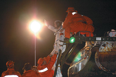5分鐘后,兩名航天員在工作人員的簇?fù)硐拢M(jìn)入著陸點100米開外的一架直升機(jī)內(nèi)全面體檢,工作人員和群眾在外焦急地等待最后的檢查結(jié)果。