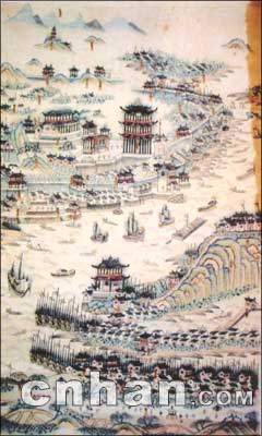 此圖藏于大連市圖書館,手繪彩圖。未標(biāo)明作者姓名和成圖時(shí)間,圖中標(biāo)注了武昌、漢口“龍王廟”等。筆者鑒定此圖為清代中期作品,根據(jù)是圖中有“龍王廟”,而龍王齋建于乾隆四年(1739年),故此圖當(dāng)于1739年以后所繪。但圖中沒有出現(xiàn)漢口城堡,而漢口城堡建于1864年,同時(shí)圖中只繪有木帆船,而未出現(xiàn)現(xiàn)近代輪船。武漢江面出現(xiàn)航運(yùn)和輪船是1862年以后。可知,此圖當(dāng)成于1862年前?纱篌w界定此圖繪于1739年至1862年之間。