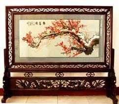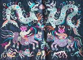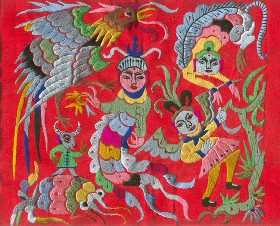 苗繡 刺繡,是苗族婦女盛裝不可或缺的飾物,主要有領(lǐng)花、肩花、襟花、背塊花、袖口花、裙鑲花、帽頂花、帽頂花等品種。苗族刺繡,整體上多為幾何構(gòu)圖,古樸多姿。其圖案因繡片條、塊的不同,分為幾何二方連續(xù)式和四方連續(xù)式構(gòu)圖。其圖案取材于生活中常見的草木、鳥獸、蟲魚、器具等。圖案的整體布局一般以菱形為立體紋樣,常見的是大菱形中套小菱形,小菱形又分別由不同色彩的方、圓、三角點(diǎn)狀組成。條狀繡片,多用點(diǎn)、線或線面組合,一整二剖構(gòu)圖。繡片是按布的經(jīng)緯戳針,故曲線多折角。大塊繡片,如背塊花等,多用菱形四方連續(xù)構(gòu)圖,并在其中布以對(duì)稱的變形幾何點(diǎn)及其他折線。所有繡片,粗看五彩斑斕,細(xì)觀則不同色線組圖分明,交錯(cuò)重疊,既復(fù)雜多變又結(jié)構(gòu)嚴(yán)謹(jǐn)、條理清晰。繡法很多,有平繡、凸繡、辮繡、堆花、縐繡、纏繡、挑繡、抽花等。平繡是最曾遍的繡法。這種繡法是重于圖案布局的美觀勻稱,色調(diào)鮮明,有明顯的物象感。凸繡流行于凱里、臺(tái)江部分地區(qū),它是在底布上多鋪幾層紙花,使所繡圖案凸出,有立體感。辮繡只在雷公山巴拉河一帶流行,其方法是將若干根色線編成辮子,按設(shè)計(jì)圖案平鋪于底布上,用絲線釘牢即成。圖案色調(diào)大致是青年女子鮮艷,中年以上婦女稍渾暗。如凱里、黃平、施秉等地,姑娘及較年輕婦女的盛裝刺繡以青布作底,繡大紅,間有少量白黃綠之色,亮麗醒目;中年以上婦女盛裝刺繡,亦以青布作底,以紫藍(lán)為基調(diào),間以少許桔紅、綠、白等色,顯得深沉穩(wěn)重。 京繡 京繡又稱宮繡,明清時(shí)期開始大為興盛,多用于宮廷裝飾、服飾,用料講究、技術(shù)精湛、格調(diào)風(fēng)雅,民間高檔的宮繡大都與皇宮有著千絲萬縷的聯(lián)系。京繡屬手工刺繡,所以在今天機(jī)繡發(fā)達(dá)的時(shí)候,為區(qū)別于機(jī)繡又名“手繡”。京繡在解放后,逐漸形成了自己鮮明的藝術(shù)特點(diǎn)與風(fēng)格,其選料精當(dāng)貴重,針工巧妙得體,色彩絢麗豪華,格調(diào)高雅。其中最好為針工中的“平金打籽”繡。這種繡,是以真金捻線盤成圖案,或結(jié)籽于其上,十分精致,華貴。 發(fā)繡 發(fā)繡,又稱“墨繡”。是以人的頭發(fā)為材料,在綢緞、絲絹或滌綸布上精心繡制的特種藝術(shù)品。具有淡雅、不褪色、耐腐蝕、利于收藏等特點(diǎn)。彩色發(fā)繡是相對(duì)于單色發(fā)繡而言,它是指以不同人種的天然色澤發(fā)絲為材料,遵循色彩規(guī)律,在繃平整的布帛上施針度線,塑造形象的藝術(shù)。作品的質(zhì)感效果特別好, 畫面有微妙的色彩變化,層次較單色發(fā)繡豐富,技巧靈活多變,形象更加栩栩如生。 材料的特質(zhì)屬性賦予發(fā)繡藝術(shù)獨(dú)特的魅力,具有豐富的人文內(nèi)涵,如用自己的頭發(fā)繡一幅寫真“二我”,具有生命的直接紀(jì)念意義。作品集繪畫與刺繡為一體,具有一定的美學(xué)價(jià)值和經(jīng)濟(jì)價(jià)值,又能經(jīng)久保存,千年不變,可謂收藏極品。 甌繡 由于溫州地處甌江之濱,故得名“甌繡”。400多年以前,浙江溫州地區(qū)已運(yùn)用刺繡美化服飾, 繡品技藝也達(dá)到相當(dāng)水平。據(jù)說甌繡最早產(chǎn)生于民間婦女之手,那時(shí)的刺繡品種有衣服、小兒帽 圈、圍涎、錦肚、婦女鞋面、枕頭、荷包等。題材只有花鳥魚蟲之類。甌繡真正成為供欣賞的藝 術(shù)品只有60多年歷史。1922年前后,溫州刺繡藝人林森友在上海一家刺繡莊發(fā)現(xiàn)了湘繡畫片, 回來后開辦了“美艷”刺繡作坊,仿照湘繡畫片的技法,改進(jìn)甌繡生產(chǎn)。從此,溫州出現(xiàn)了甌繡畫片。