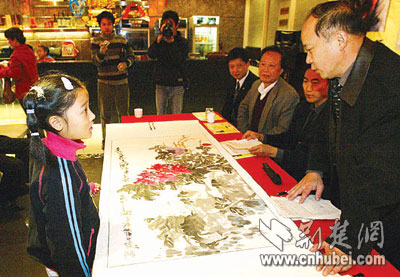 “劉老師,看看我的畫(huà)吧!”9歲的張俁俁是武昌中華路小學(xué)學(xué)生,她第一個(gè)交出自己的牡丹長(zhǎng)卷請(qǐng)老師“檢閱”。陪同前來(lái)的母親吳女士在一旁介紹:“俁俁看到報(bào)紙后就一直惦念這事。今天一早她就起床了,拉著我跟她外婆往這趕。”