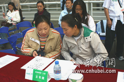 在和王軍霞的交談中得知這是她第二次來武漢,她說她對武漢的印象不錯,特別是群眾性的健身活動。這次在現(xiàn)場看到有這么多的市民自愿來參加健康跑,她覺得很高興和欣慰,因為她現(xiàn)在的身份就是健康跑的推廣大使,希望有更多的人參與在這項方便易行的活動中去,增加體質(zhì),為國為民為自己。當(dāng)我告訴她是因為她的到來才吸引了這么多的人來參加活動時,她覺得很驚喜!叭绻@樣能吸引更多的人,我想我的付出是值得的!”