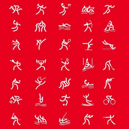 北京奧運(yùn)會(huì)體育圖標(biāo)設(shè)計(jì)包括35個(gè)圖標(biāo),分別是田徑、賽艇、羽毛球、棒球、籃球、拳擊、皮筏艇(靜水)、皮筏艇(激流)、自行車、馬術(shù)、擊劍、足球、體操、藝術(shù)體操、蹦床、舉重、手球、曲棍球、柔道、摔跤、游泳、花樣游泳、跳水、水球、現(xiàn)代五項(xiàng)、壘球、跆拳道、網(wǎng)球、乒乓球、射擊、射箭、鐵人三項(xiàng)、帆船、排球和沙灘排球。