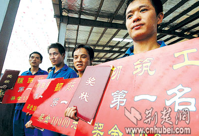 荊楚網(wǎng)(楚天都市報(bào)) 記者 黃宏 劉中燦 通訊員 鄒清選 熊煥武 攝 全省首屆建筑業(yè)技能大賽昨日落下帷幕,梁平泉、殷雄、蘇洪生、陶猛4位農(nóng)民工從省領(lǐng)導(dǎo)手中接過一等獎(jiǎng)的獲獎(jiǎng)證書,喜當(dāng)技能狀元,當(dāng)場(chǎng)各獲獎(jiǎng)金1萬(wàn)元。