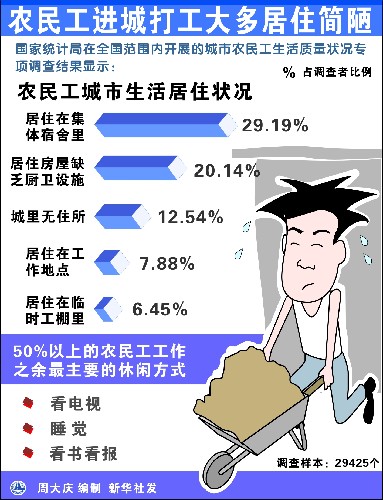 雖然生活條件普遍較差,勞動強度大,社會保障差,文化娛樂少,但多數(shù)農(nóng)民工仍然認可目前在城市的生存現(xiàn)狀,對未來生活充滿希望。國家統(tǒng)計局25日發(fā)布的一項調(diào)查結果中這樣說。