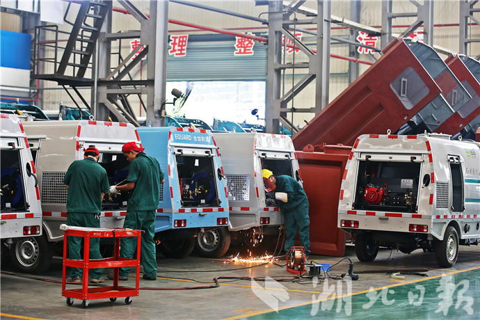 8月8日,湖北合加環(huán)境設(shè)備有限公司的工人正在裝配環(huán)衛(wèi)車。(記者梅濤 攝)