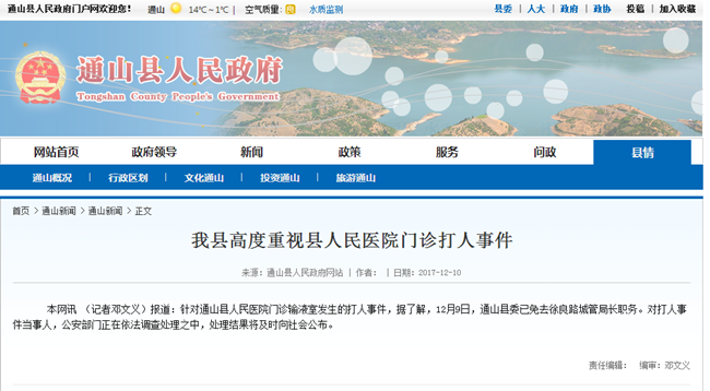 據(jù)通山縣委宣傳部通報(bào):2017年12月8日中午,通山縣人民醫(yī)院門診輸液室發(fā)生打人事件 ,通山縣公安局及時(shí)出警調(diào)查取證。事件發(fā)生后,通山縣委、縣政府高度重視,組建專班進(jìn)行處置,召集縣政府應(yīng)急辦、 公安局、衛(wèi)計(jì)局、縣人民醫(yī)院等部門負(fù)責(zé)人會(huì)議:由縣人民醫(yī)院院長成忠了負(fù)責(zé)組建醫(yī)療專班,做好治療護(hù)理工作;由縣 人民政府副縣長金大德負(fù)責(zé)組建公安調(diào)查專班,確保處置及時(shí)快速、公平公正。該事件正在調(diào)查處置中,處置結(jié)果將及時(shí) 向社會(huì)公布。