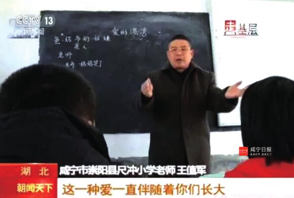 在剛剛過去的元旦佳節(jié),央視《朝聞天下》欄目播出了一則《大山里的擺渡老師》的新聞,在本地教育系統(tǒng)刷屏。新聞的主人公就是崇陽縣尺沖小學教師王值軍,在這則近8分鐘的新聞里,記錄了王老師接送學生上下學、上課、走訪留守兒童家庭等日常工作生活常態(tài),展現(xiàn)農(nóng)村教師堅守大山,關(guān)愛學生的高尚道德情操。