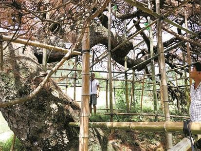 有村民翻出楊家族譜,上有清代進(jìn)士楊保田于光緒三十四年為這棵樹(shù)寫(xiě)的詩(shī):蒼蒼盤郁萬(wàn)年松,一種菁華虎膝鐘;鬼影婆娑園大蓋,虬枝屈曲蔭全宗;煙云繞干龍鱗老,風(fēng)雨鳴濤鶴夢(mèng)濃;每值歲寒貞晚節(jié),芳心何受大夫封?!斑@棵樹(shù)就是我們村灣的不老標(biāo)志!”在外經(jīng)商的村民楊財(cái)義拿出一張發(fā)黃的照片說(shuō),臥龍古松看著他們長(zhǎng)大,承載著他們童年的記憶,他們?cè)黄鹪跇?shù)上玩耍,偷吃父輩們曬的花生。夏夜坐在樹(shù)底下,聽(tīng)大人講五湖四海的故事。如今在外闖蕩,拖著疲憊身體回來(lái),到樹(shù)下走一走,心中愁緒一掃而空?!罢l(shuí)能救活這棵樹(shù),我們捐款打賞!”上楊灣的微信群里,每天都有村民詢問(wèn)樹(shù)的狀況??粗鴺?shù)葉日益變黃,村民們無(wú)不焦心,最后一致提議,只要有人能救活樹(shù),全村人將共同捐款打賞這位能人。