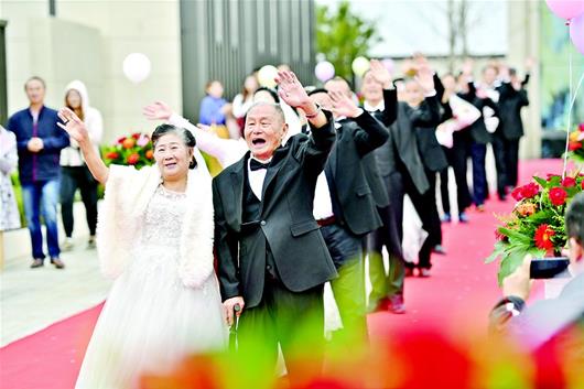 圖為:老人們穿禮服攜手走紅毯