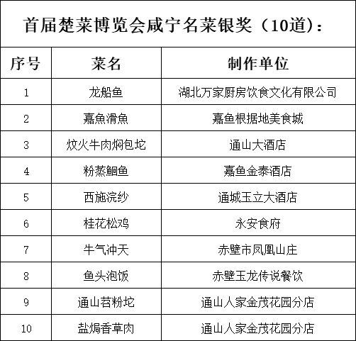 湖北省首屆楚菜博覽會(huì)咸寧分會(huì)評選頒獎(jiǎng)名單如下: