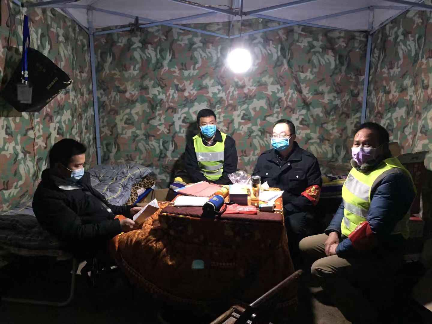 義源村的另一處臨時(shí)關(guān)卡點(diǎn),16名黨員干部憑著幾把凳子,幾床被褥堅(jiān)守陣 地,從1月25日開始, 24小時(shí)輪班執(zhí)勤,對外來人員車輛進(jìn)行勸返消毒,嚴(yán)防死守, 為全村疫情防控工作構(gòu)筑了一道牢固的安全網(wǎng)、防護(hù)欄。