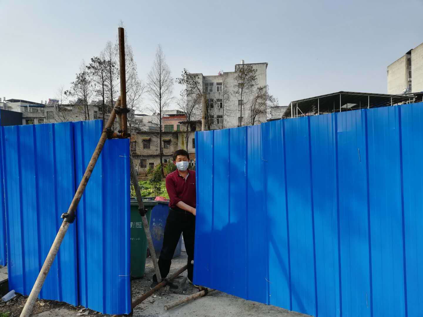 自臘月二十九日開始,村干部們帶頭上,購買了樹木、鐵皮,立樹樁,釘鐵皮墻。大道兩邊相向設(shè)置,從南門河四橋開始,一直到城內(nèi)小區(qū)。到大年三十晚上,兩道藍色的“屏障”悄悄立起,它們“環(huán)著村、環(huán)著城”,成為斬斷疫魔的“致命一招”。
