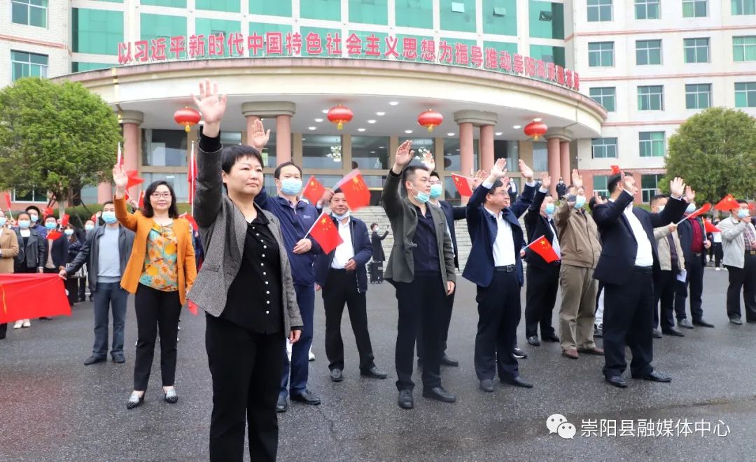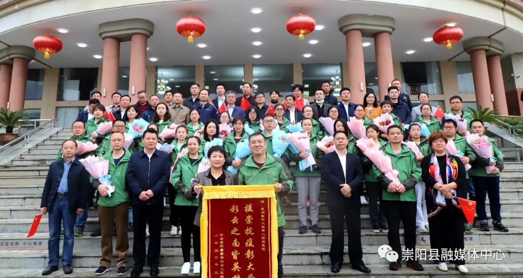 送別儀式上,杭鶯、鄭俊華等縣領(lǐng)導(dǎo)為全體云南醫(yī)療隊(duì)隊(duì)員獻(xiàn)上鮮花。隨后,杭鶯向云南醫(yī)療隊(duì)隊(duì)長(zhǎng)董昭興頒授印有“援崇抗疫彰大愛 彩云之南皆英雄”錦旗并合影留念。
