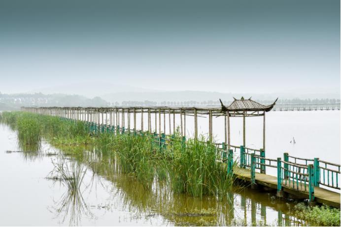 當(dāng)天,木制釣魚(yú)臺(tái)上,一位50余歲的游客在休閑小釣。垂竿拋,紅煙斂,大有一番“人疑天上坐,魚(yú)似鏡中懸”的味道。也有三兩游客櫓槳戲水,一不小心,驚擾了覓食的魚(yú)兒,“潑刺”一聲,慌亂中撲騰至遠(yuǎn)處,不見(jiàn)蹤影。