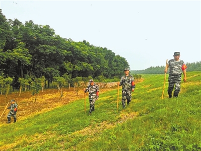 “這個(gè)插上紅旗做標(biāo)志的地方是地質(zhì)鉆口,雖已封口,但每次巡堤一定要來(lái)檢查,看周圍是否有異常……”這是朱天志給新上堤的“90后”防汛突擊隊(duì)員唐文講巡堤技巧和相關(guān)要領(lǐng)。