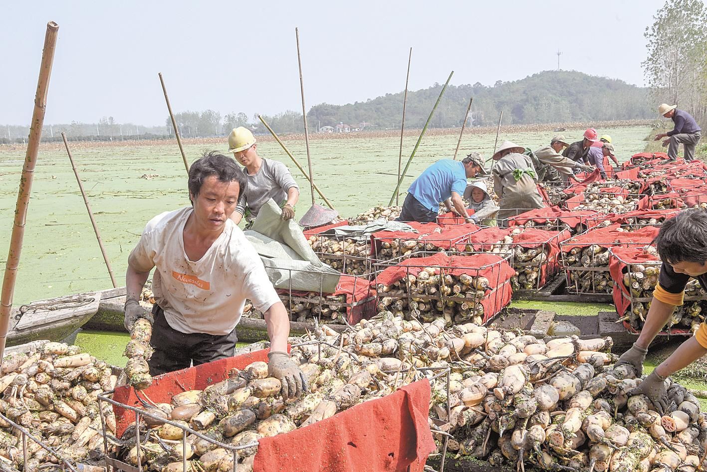 10月13日,嘉魚縣陸溪鎮(zhèn)農(nóng)民趁著晴好天氣挖藕。這些蓮藕經(jīng)嘉魚鴻富農(nóng)產(chǎn)品有限公司加工后,將出口至東南亞和北美等地區(qū)。嘉魚縣蓮藕、蓮子、藕帶是區(qū)域特色明顯的優(yōu)勢農(nóng)產(chǎn)品。近年來,嘉魚縣把發(fā)展蓮藕作為調(diào)整農(nóng)業(yè)產(chǎn)業(yè)結(jié)構(gòu)、增加農(nóng)民收入的重要途徑。目前,全縣蓮藕種植面積4.85萬畝,2019年全縣蓮藕產(chǎn)業(yè)實(shí)現(xiàn)綜合產(chǎn)值5.6億元。
