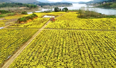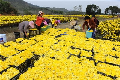 11月4日,通山縣燕廈鄉(xiāng)湖畔村皇菊種植基地,金絲皇菊怒放,猶如一張金色地毯舒展在田野上,村民穿梭在花叢中采收菊花。燕廈鄉(xiāng)湖畔村是典型的庫區(qū)貧困村,近年來,市公共檢驗(yàn)檢測中心駐村工作隊和燕廈鄉(xiāng)黨委政府結(jié)合湖畔村地理環(huán)境,成立村集體合作社,打造60畝金絲皇菊種植基地,延伸菊花深加工產(chǎn)業(yè)鏈,通過與貧困戶采取“勞務(wù)聯(lián)結(jié)機(jī)制”簽署合同協(xié)議,讓村民實(shí)現(xiàn)家門口就業(yè)。