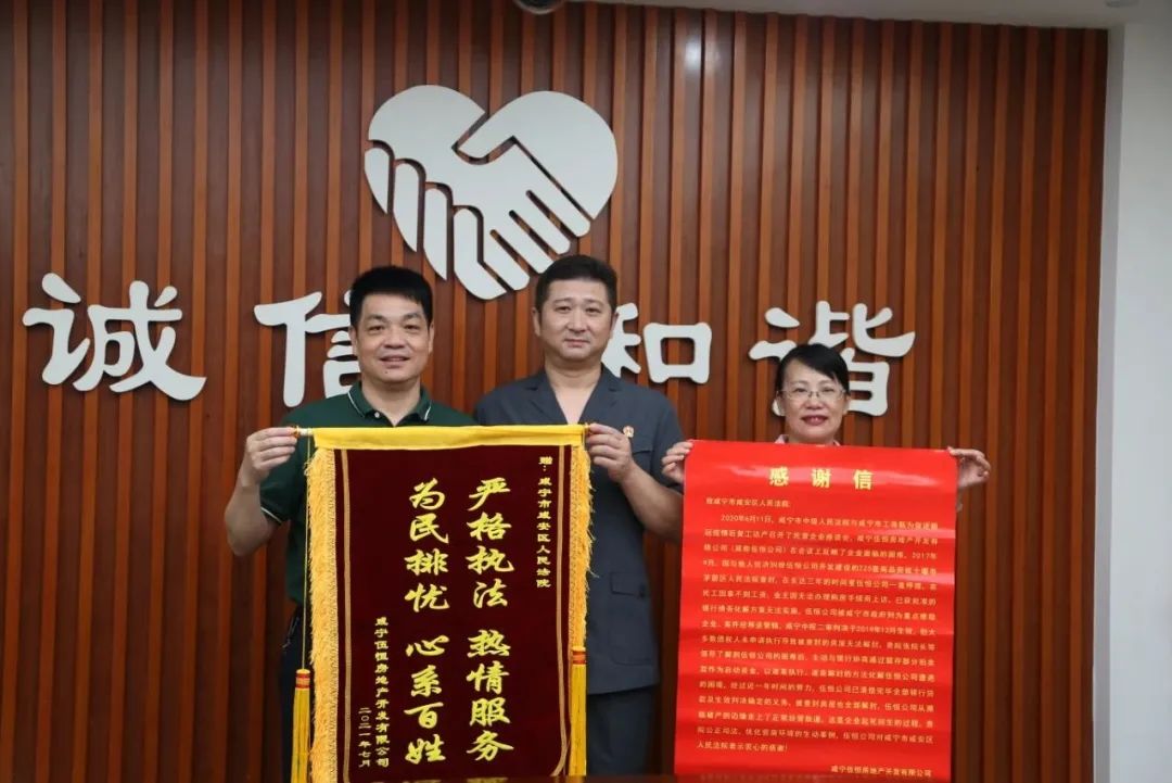 “感謝咸安區(qū)法院,讓我們公司從瀕臨破產(chǎn)的邊緣走回正常經(jīng)營的軌道,幫助我們起死回生......”7月16日下午,咸寧伍恒房地產(chǎn)開發(fā)有限公司(以下簡稱伍恒公司)負責人將一面寫有“嚴格執(zhí)法,熱情服務;為民排憂,心系百姓”的錦旗和一封感謝信送至咸安區(qū)法院,感謝區(qū)法院執(zhí)行局善意文明執(zhí)行,幫助企業(yè)渡過難關。