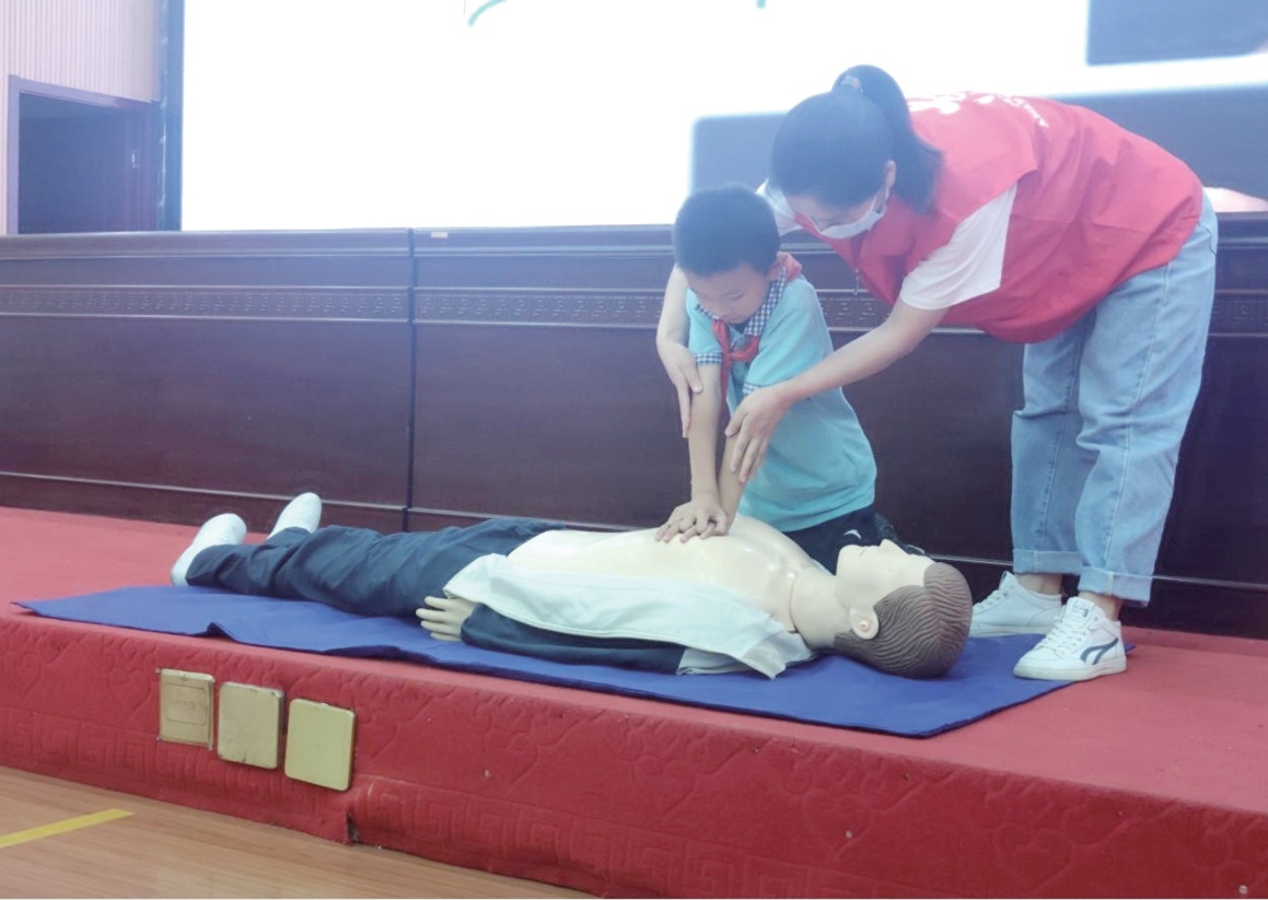 活動現(xiàn)場,杜成芬還為大家演示了心肺復(fù)蘇術(shù)和海姆立克急救法,學(xué)生們在老師的指導(dǎo)下認(rèn)真學(xué)習(xí)演練。