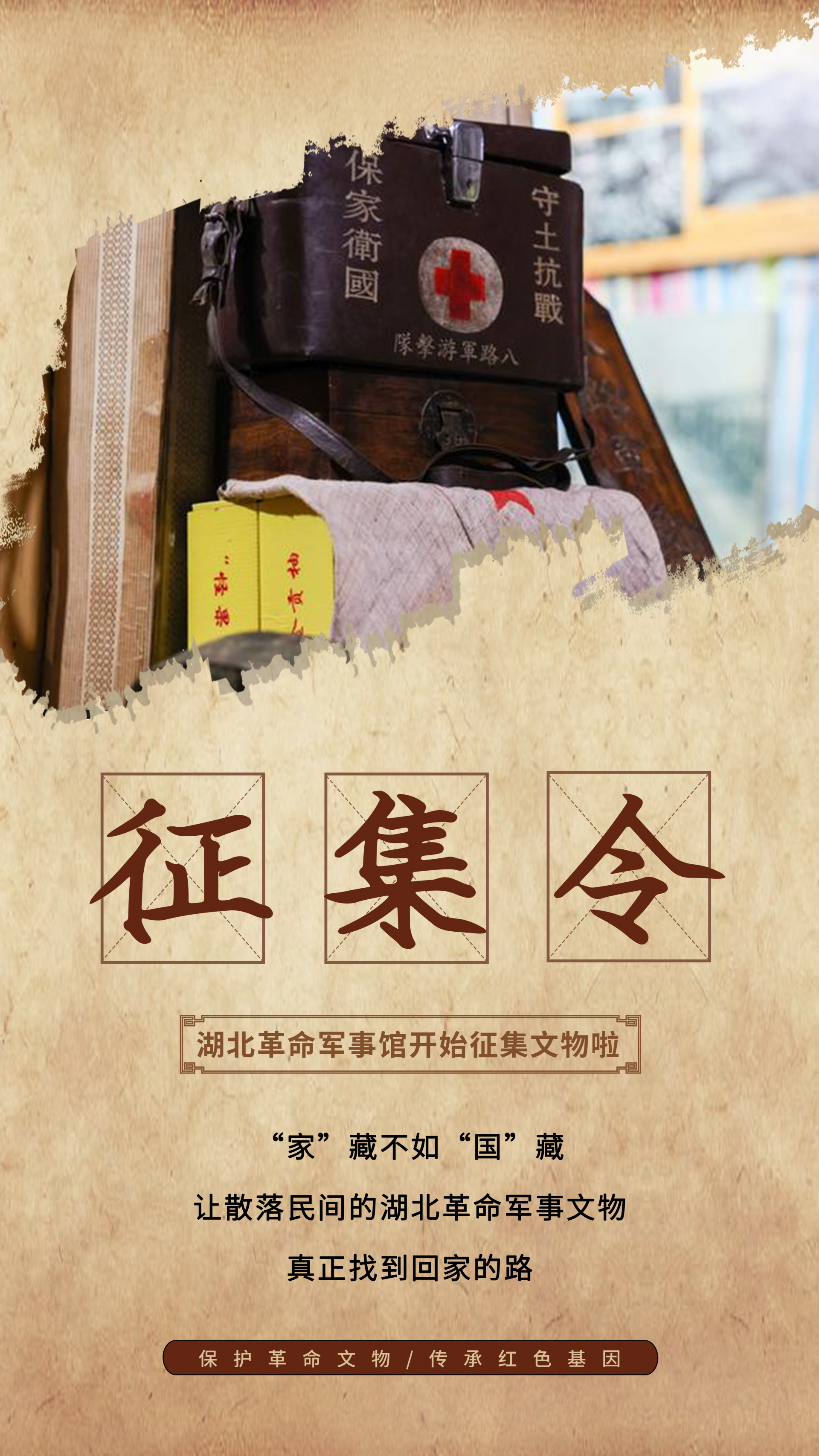 為貫徹落實習近平總書記關(guān)于傳承紅色基因的重要指示精神,高標準做好湖北革命軍事館籌建工作,集中展示中國共產(chǎn)黨在湖北領(lǐng)導(dǎo)武裝斗爭史、新中國國防建設(shè)史和新時代強軍興軍偉大實踐,延伸展示軍事歷史文化、兵要地志和武器裝備,精心打造傳承紅色基因、宣揚強軍成就、普及國防教育的紅色殿堂,根據(jù)建館工作需要,湖北革命軍事館現(xiàn)面向社會各界公開征集革命文物(實物)史料。
