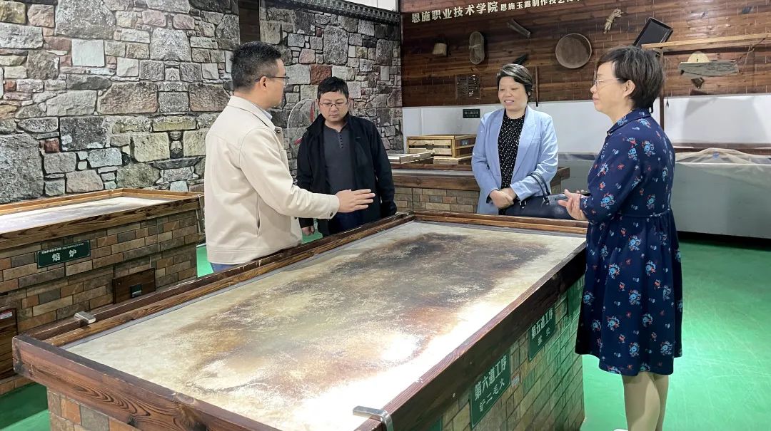 期間,評(píng)估小組一行赴恩施職業(yè)技術(shù)學(xué)院-恩施玉露制作技藝傳承培訓(xùn)基地現(xiàn)場(chǎng)調(diào)研。隨后,在恩施市非遺中心與恩施市國(guó)家級(jí)、省級(jí)非遺代表性傳承人召開(kāi)座談會(huì),對(duì)恩施市非遺代表性傳承人及傳承基地開(kāi)展傳承培訓(xùn)和宣傳推廣工作給予肯定,評(píng)估小組一行鼓勵(lì)代表性傳承人進(jìn)一步開(kāi)展宣傳展示活動(dòng),并為寶貴的非物質(zhì)文化遺產(chǎn)項(xiàng)目多培養(yǎng)后繼人才。