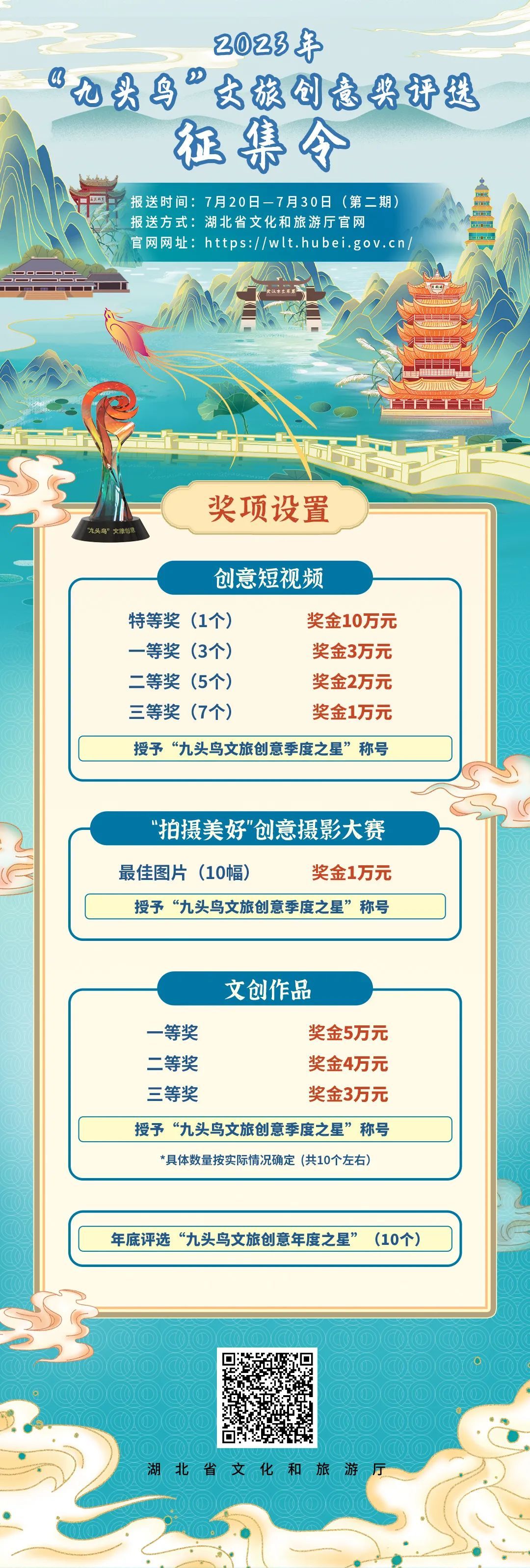 湖北省文化和旅游廳相關(guān)負責(zé)人介紹,2023年“九頭鳥”文旅創(chuàng)意獎評選活動將繼續(xù)緊扣新時代新媒體傳播特點,對參評作品不設(shè)門檻,只要與湖北文旅有關(guān)的創(chuàng)意短視頻、創(chuàng)意攝影、文創(chuàng)作品等均可參評。其中,創(chuàng)意短視頻、創(chuàng)意攝影主要以網(wǎng)絡(luò)傳播量來評判作品,文創(chuàng)作品綜合考量網(wǎng)絡(luò)傳播量和專家評審意見。網(wǎng)友可以關(guān)注湖北省文化和旅游廳官方網(wǎng)站通知并報送作品,首次報送將于7月20日開始。