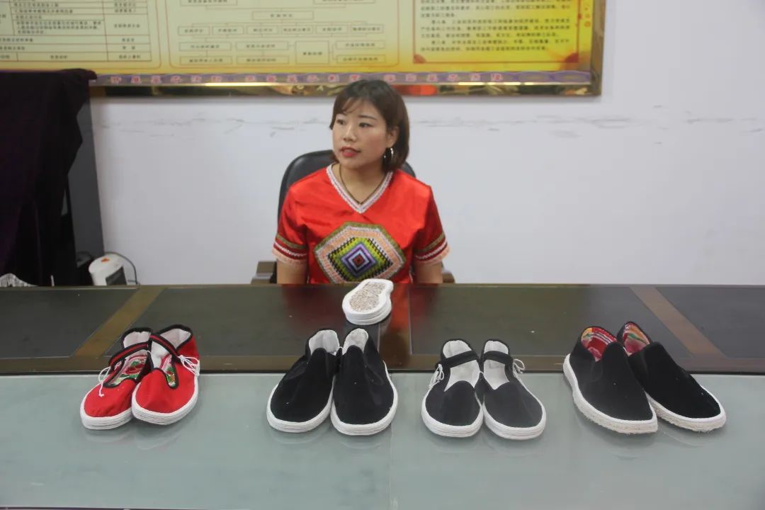 紅土鄉(xiāng)蔣秋菊展示自己制作的手工布鞋