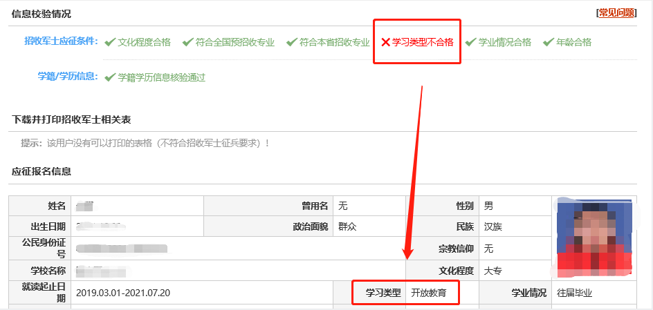 比如有的青年學歷為開放教育,故未通過: