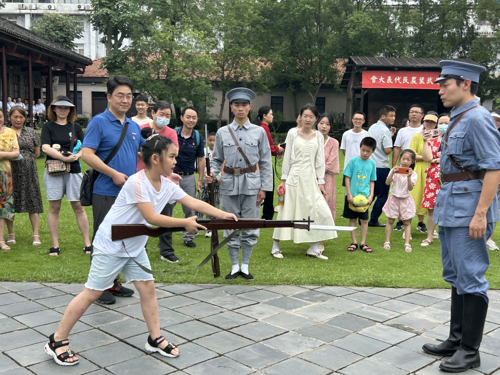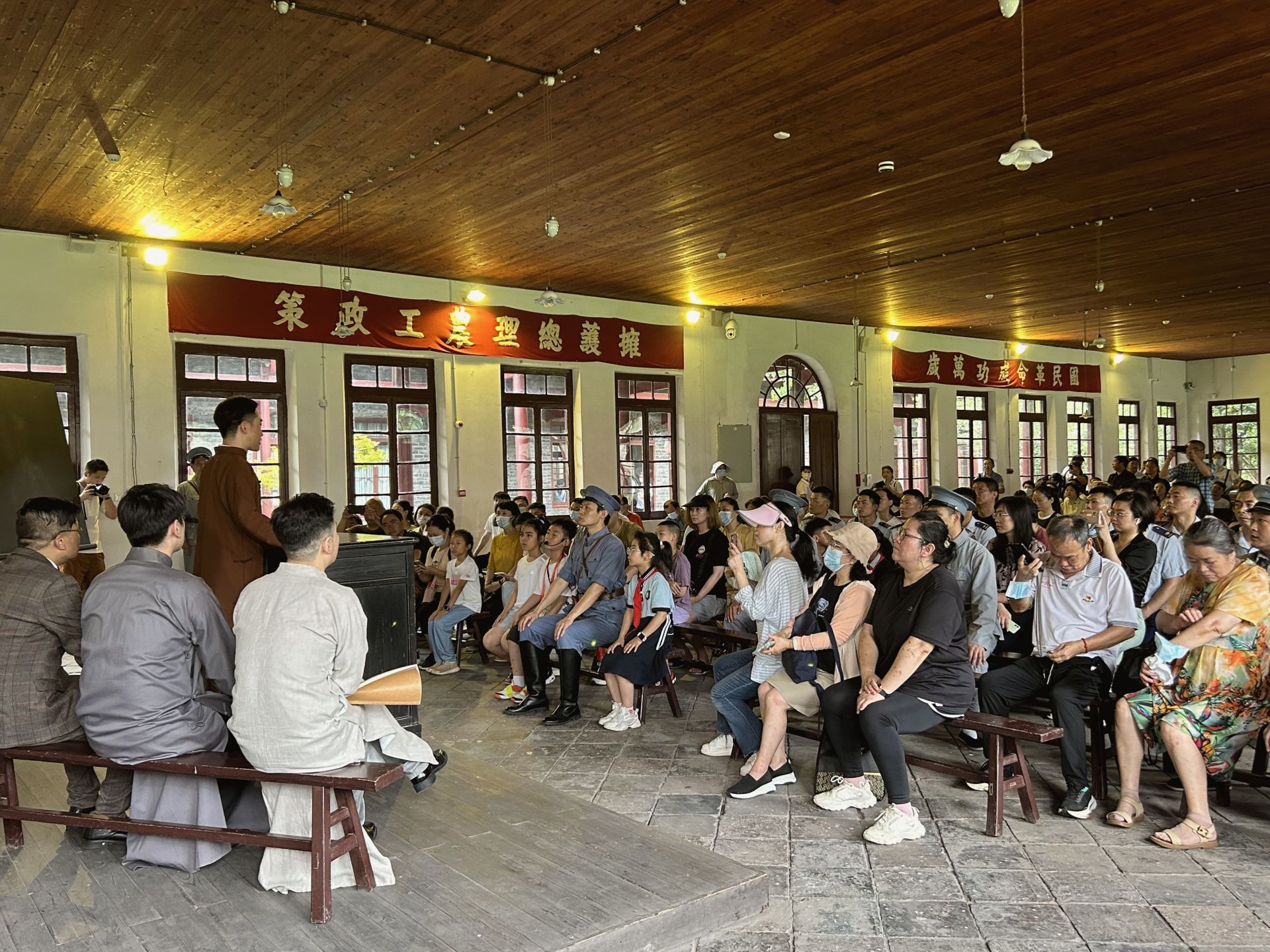 一幕幕歷史場景在革命舊址中鋪陳開來,觀眾們化身為“農(nóng)講所學員”“中共五大代表”等, 全程參與其中,穿越時空和革命先輩進行歷史的對話。