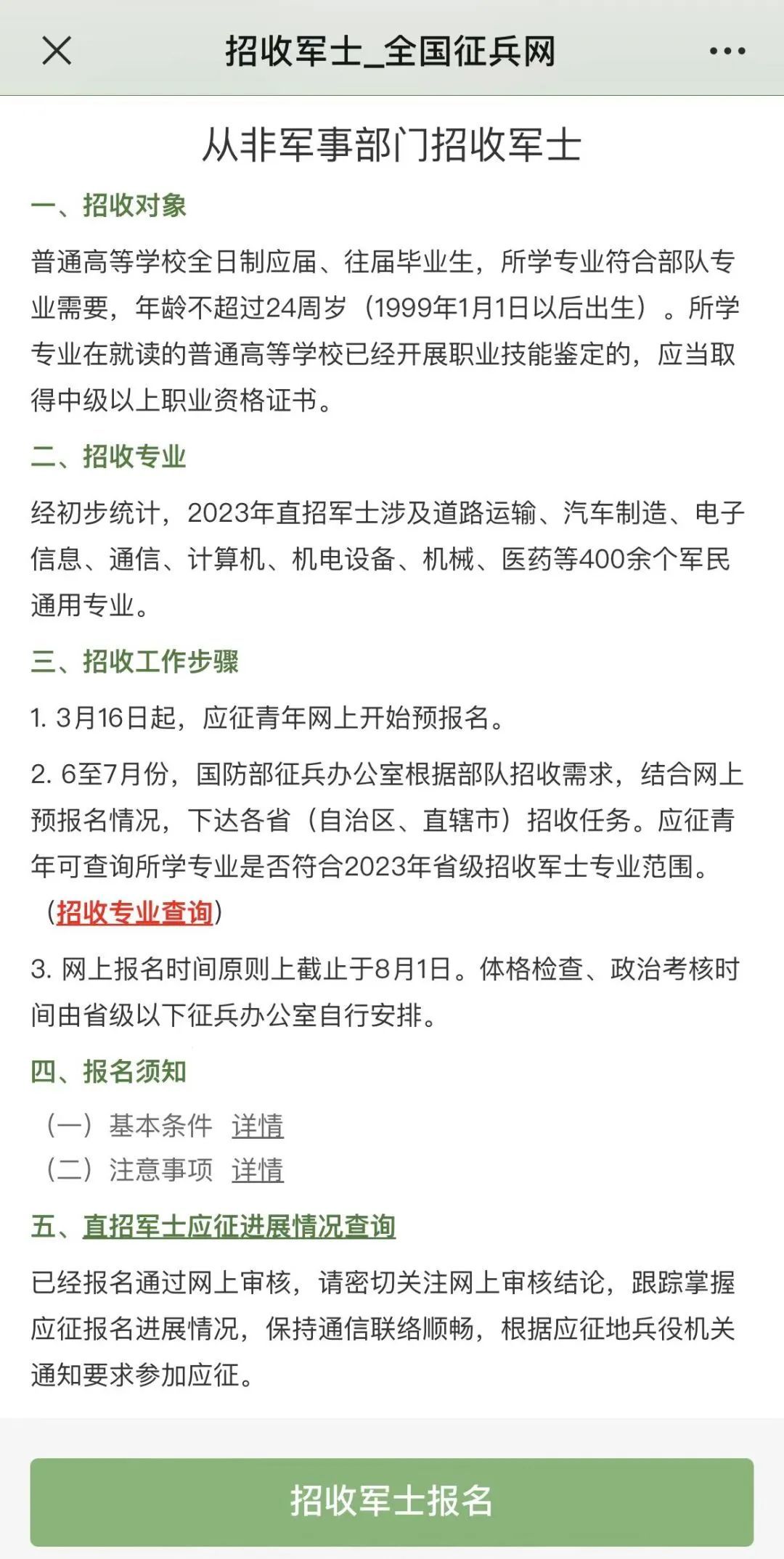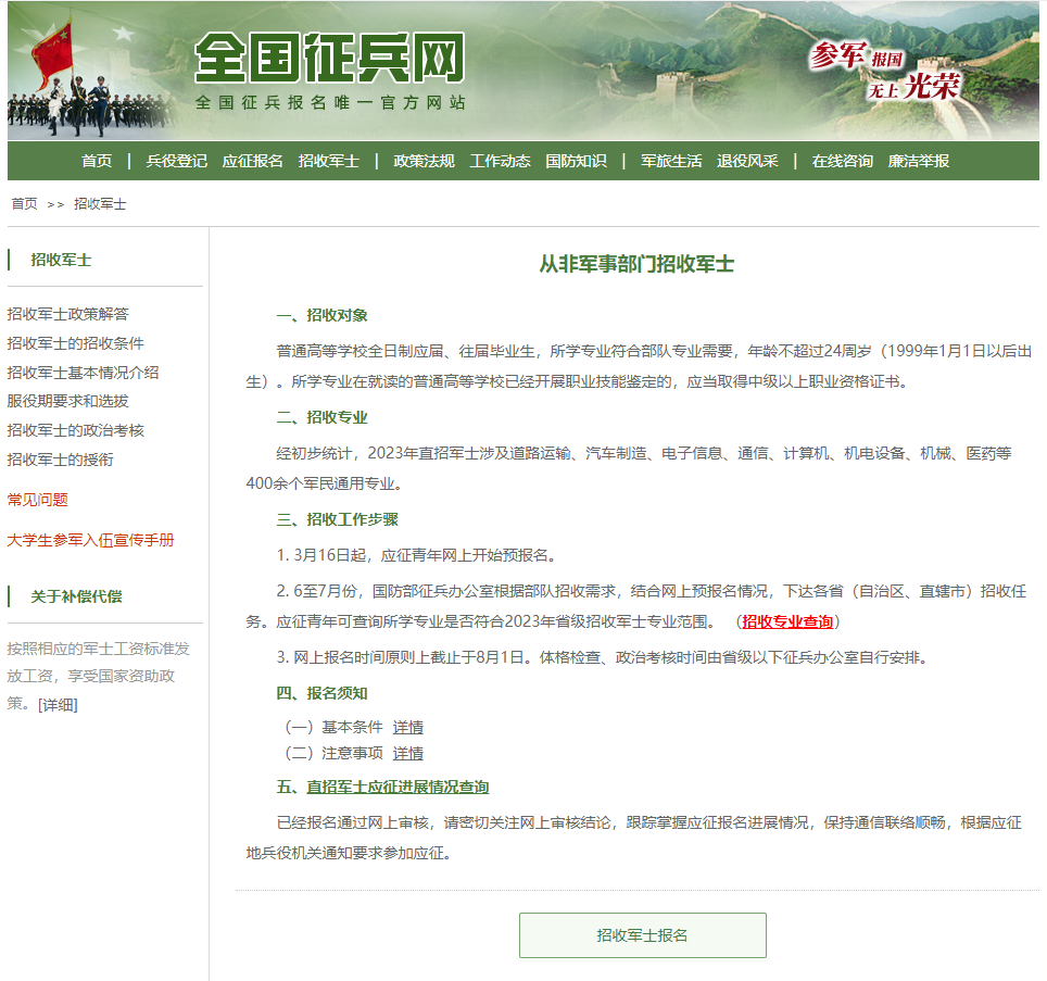 采取網(wǎng)上報(bào)名的方式,應(yīng)征青年登錄“全國征兵網(wǎng)”,點(diǎn)擊“招收軍士報(bào)名”查詢招收專業(yè)并進(jìn)行報(bào)名。