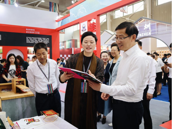文化和旅游部黨組成員、副部長饒權(quán),新疆維吾爾自治區(qū)黨委黨的建設(shè)工作領(lǐng)導(dǎo)小組副組長田文等領(lǐng)導(dǎo)參觀了湖北展區(qū),并與傳承人進(jìn)行親切交流,了解傳承發(fā)展情況。