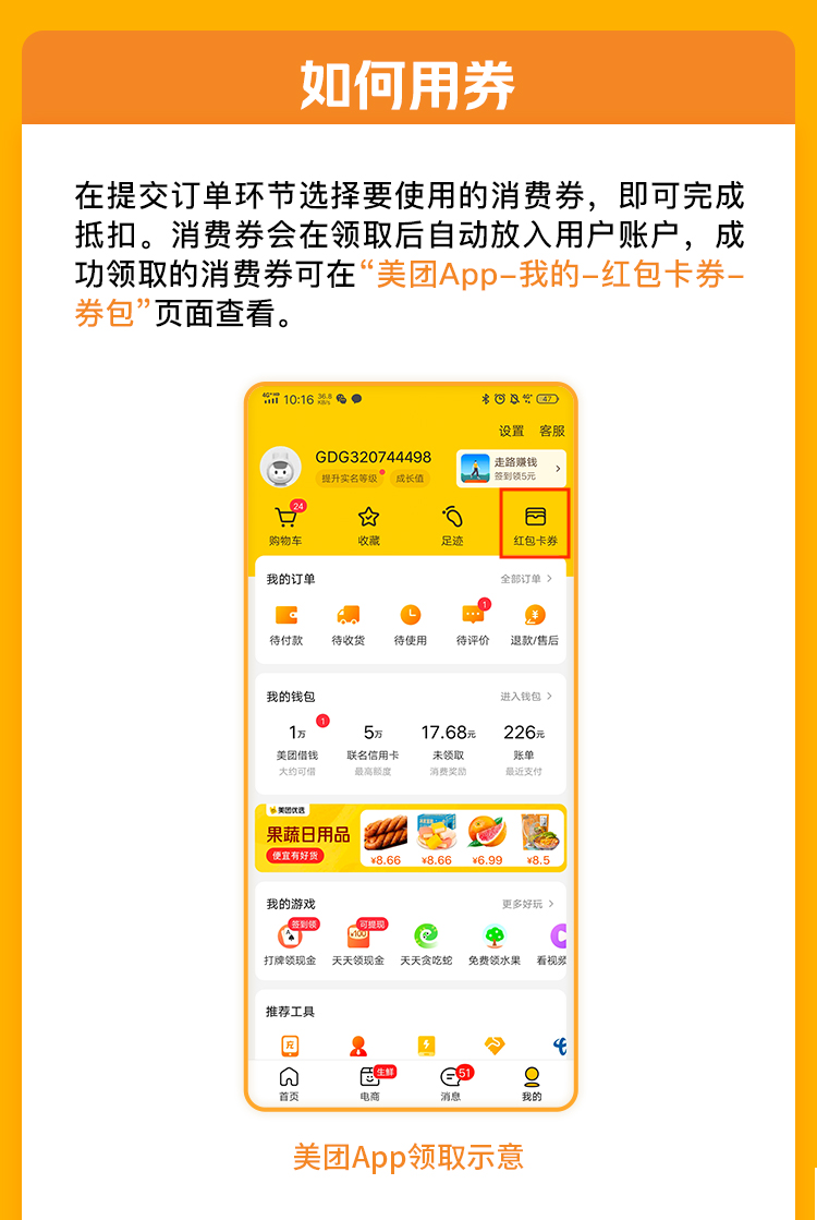 3.用券要求。消費(fèi)者在下單購買或支付消費(fèi)券使用范圍內(nèi)的產(chǎn)品和服務(wù)時(shí),應(yīng)在享受平臺和商戶已有優(yōu)惠折扣后,于最后支付環(huán)節(jié)使用消費(fèi)券。