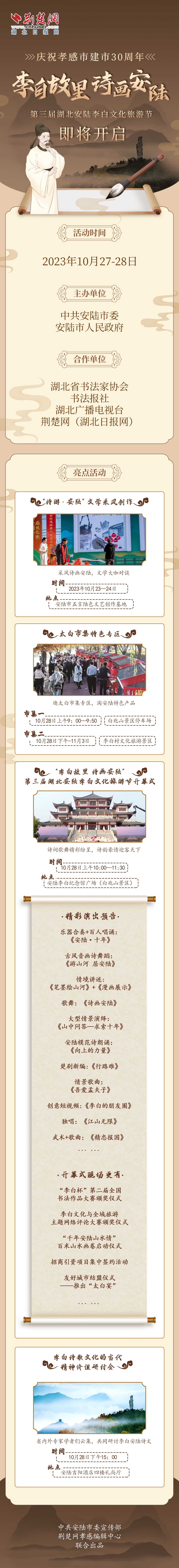 荊楚網(wǎng)(湖北日?qǐng)?bào)網(wǎng))訊(記者黃菲 通訊員劉壯)又是一年銀杏黃,涢城處處飄墨香。“李白故里,詩(shī)畫(huà)安陸”——慶祝孝感市建市30周年暨第三屆湖北安陸李白文化旅游節(jié)將于10月28日盛大開(kāi)幕。本屆李白文化旅游節(jié)有哪些精彩亮點(diǎn)呢?一起來(lái)看看!