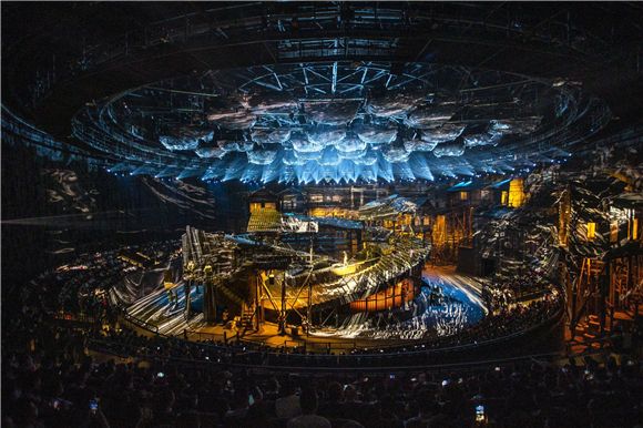 《重慶·1949》總出品人、重慶興亞控股集團(tuán)有限公司董事長(zhǎng)宋曉平對(duì)華龍網(wǎng)記者介紹說(shuō),舞臺(tái)的5個(gè)環(huán)獨(dú)立運(yùn)轉(zhuǎn),在運(yùn)轉(zhuǎn)過(guò)程中會(huì)分很多方向運(yùn)動(dòng),每十度變換一個(gè)場(chǎng)景,一共可變換出6000多萬(wàn)個(gè)可視場(chǎng)景。