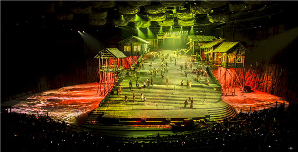 該劇用大膽、創(chuàng)新的藝術(shù)手法,讓更多的觀眾能夠沉浸在劇中,與英雄“對(duì)話”。據(jù)介紹,磁器口碼頭的舞臺(tái)搭建是用磚石砌成72個(gè)臺(tái)階,用約2000根柱子搭建起18米高的世界最大室內(nèi)吊腳樓建筑群,用160個(gè)獨(dú)立頂部懸吊電機(jī)組成燈光舞美裝置,用超20臺(tái)空中旋轉(zhuǎn)升降的燈光車來(lái)完成的……縱深的空間感,逼真的場(chǎng)景,完美再現(xiàn)40年代重慶城市風(fēng)貌。演藝空間與觀演空間交相穿插。觀眾與演出融為一體,經(jīng)歷一場(chǎng)身臨其境的獨(dú)特觀演體驗(yàn)。