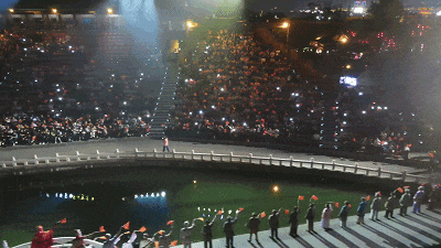 近萬名觀眾一起揮動手中的紅旗,