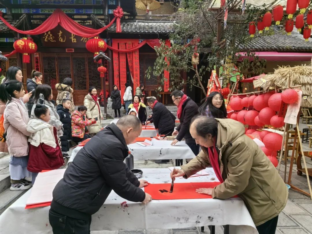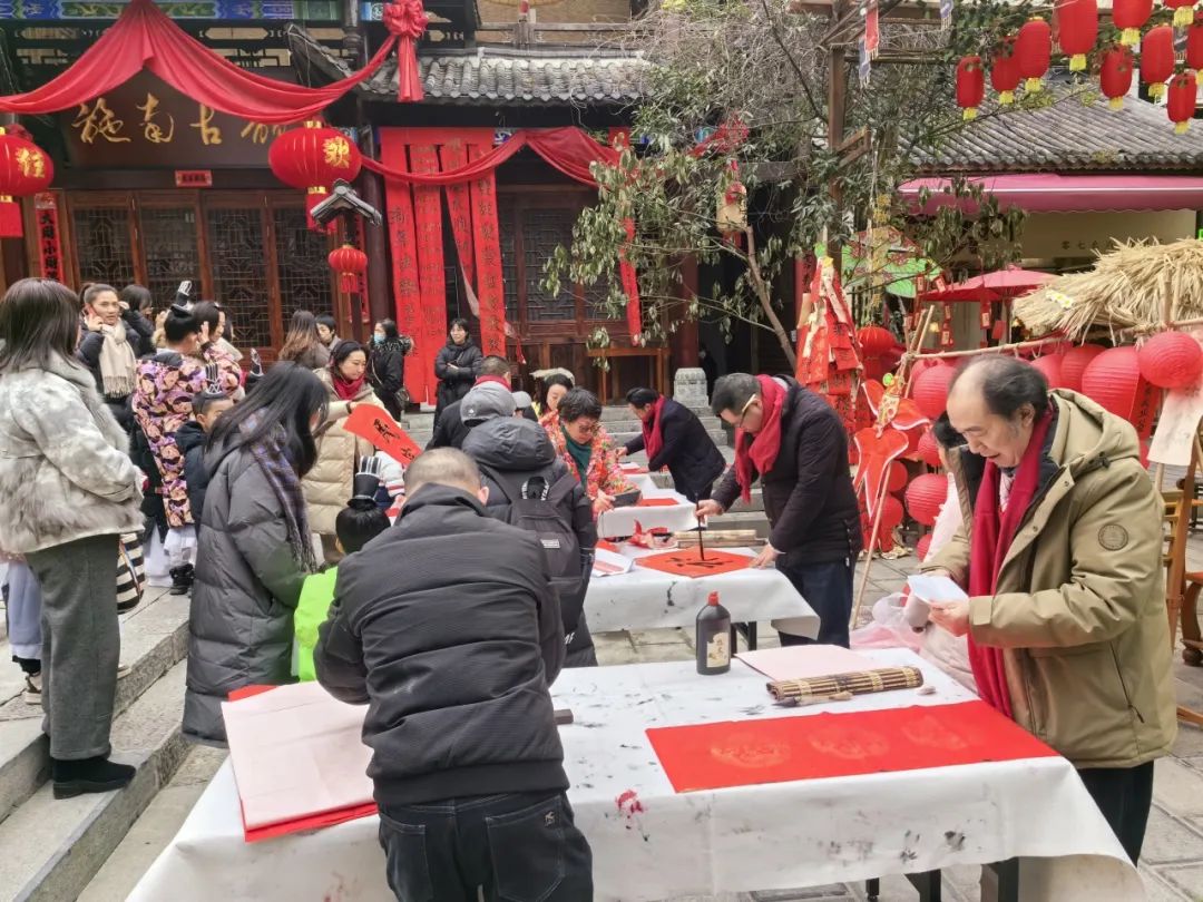 “辰龍送瑞,春聯(lián)送?!?。在女兒城非遺劇場門口,免費(fèi)送春聯(lián)活動(dòng)準(zhǔn)時(shí)開始。翰墨飄香迎新春,筆墨濃情送祝福,書法老師們揮毫潑墨、凝神動(dòng)筆,市民朋友圍成環(huán)裝認(rèn)真觀賞,一時(shí)間紅紙翻飛墨香四溢,一副副充滿吉祥如意祝福的手寫春聯(lián)呈現(xiàn)在人們眼前。