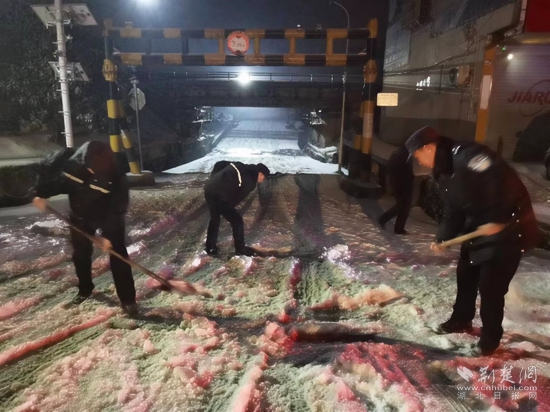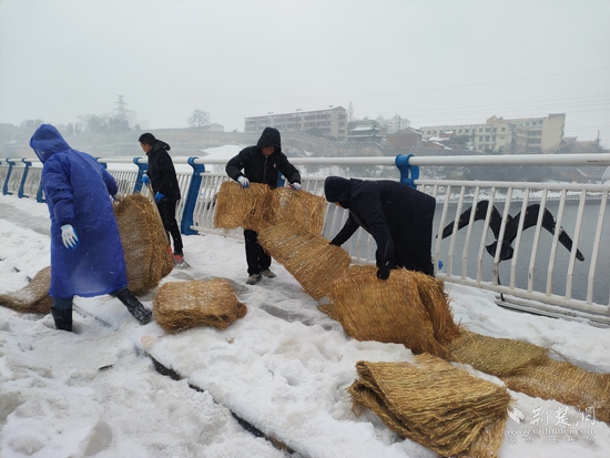 2月22日上午,在東洲橋路段掃雪現(xiàn)場(chǎng),赤壁市建工集團(tuán)工作人員正頂風(fēng)冒雪手持鐵鍬、雪鏟等清掃工具,鏟除橋梁上的積雪,鋪設(shè)草毯防滑。