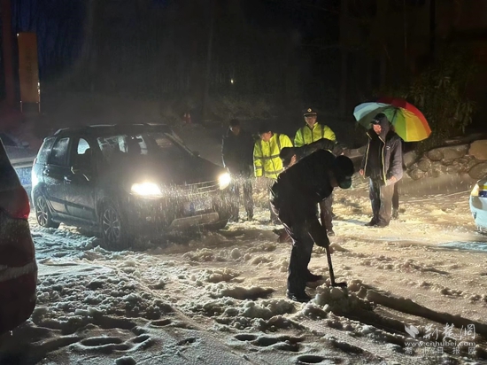 赤壁市公安局民警立即冒雪進(jìn)行救助,最大限度為受困受阻車輛司乘人員提供幫助。同時(shí)對(duì)路面進(jìn)行緊急清理,消除安全隱患,現(xiàn)場(chǎng)疏導(dǎo)車流,確保盡快恢復(fù)正常通行。