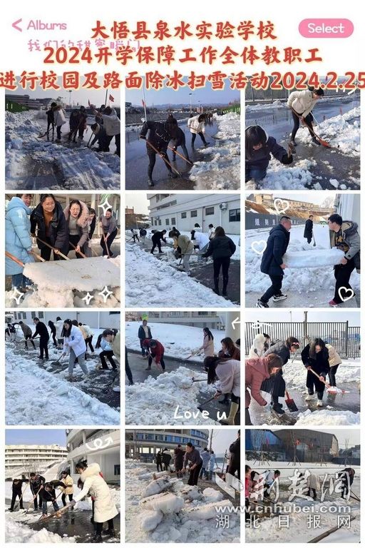 2月25日至26日,大悟中職校、思源實驗學(xué)校、縣直機關(guān)幼兒園組織、縣泉水實驗學(xué)校分別組織全校教職工對學(xué)校大門口、校園內(nèi)各主干道、階梯等重點通行路段進行了掃雪除冰,讓校區(qū)的道路變得暢通,干凈清潔,為師生返校營造安全、整潔、幸福的環(huán)境。