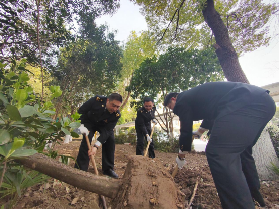 活動(dòng)得到了全體干部職工的積極響應(yīng),在荊州海關(guān)前院西面灌木區(qū),眾人手持鐵鍬、鋤頭,一同挖坑、扛苗、散苗、擺正樹苗、培土澆水,干勁十足,熱火朝天。