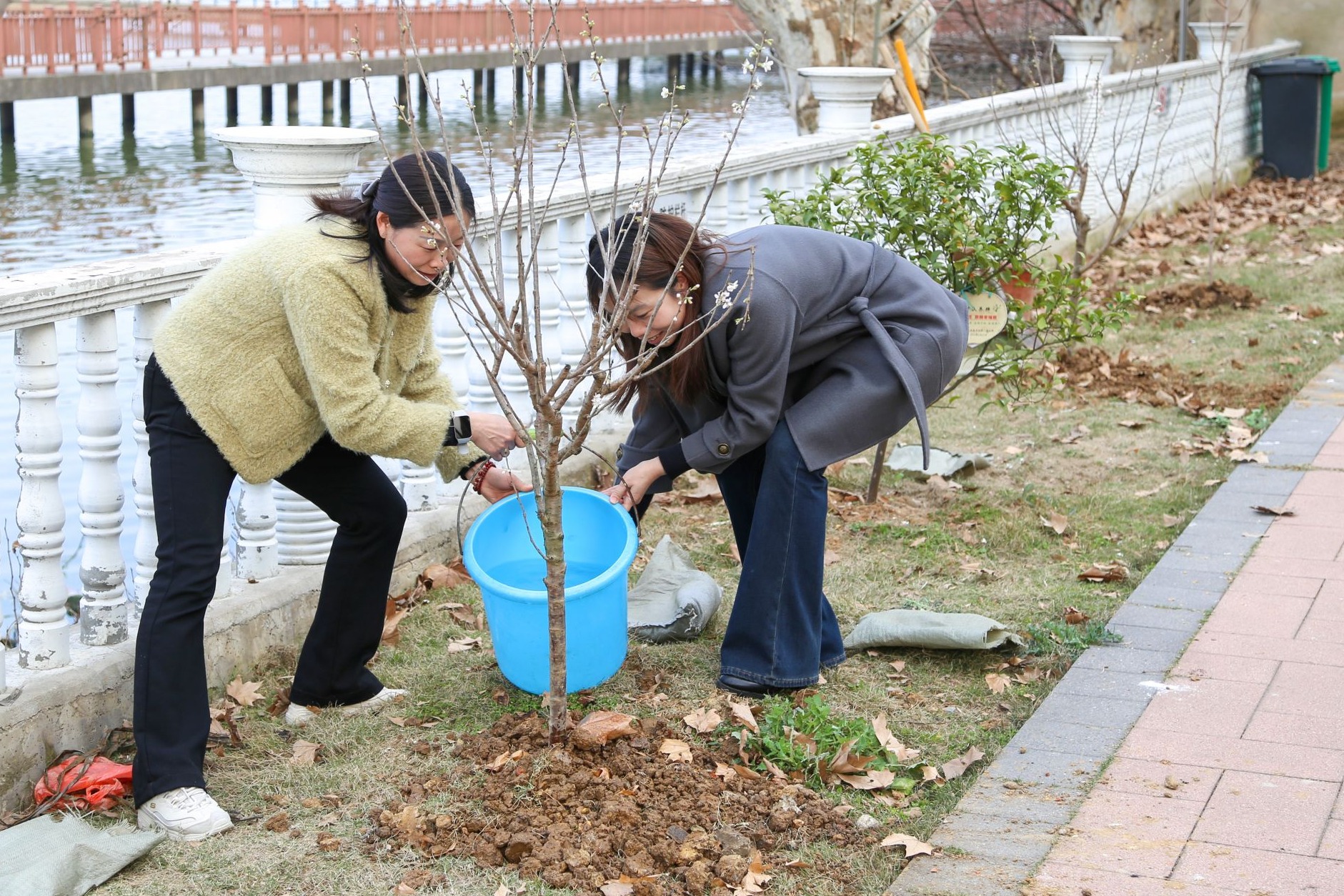植樹地點(diǎn)選在單位后院花園,活動(dòng)規(guī)模不大,但現(xiàn)場(chǎng)氣氛很活躍。大家笑意盎然,揮鋤培新土,施肥育根基,澆水潤(rùn)新枝。經(jīng)過(guò)半小時(shí)的精心栽種,六棵樹苗傲然挺立在草坪上,為花園增添了一抹欣欣向榮的綠意。