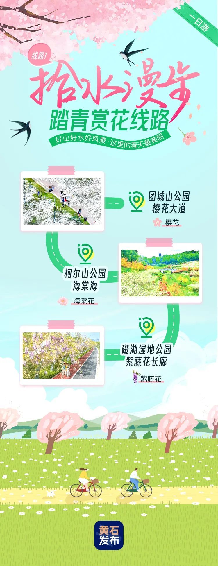 團城山公園櫻花大道-柯爾山公園海棠海-磁湖濕地公園紫藤花長廊