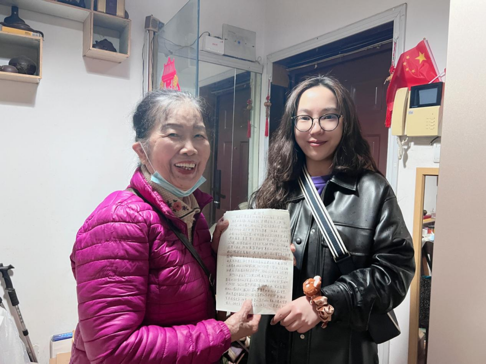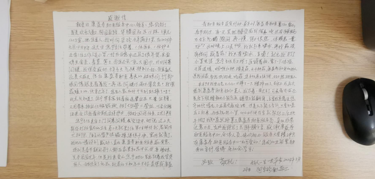 信中寫到康益壽助老服務(wù)中心焦主任帶著醫(yī)護(hù)人員多次拜訪看望她,不僅是將醫(yī)護(hù)人員帶上門進(jìn)行了常規(guī)的血壓、血糖檢測等醫(yī)療服務(wù),還考慮到她平時獨(dú)居不太方便,更貼心的為她準(zhǔn)備了許多米面、雞蛋、青菜等生活物資以及安排保潔人員上門打掃。3月9日老人乘坐公交時把腰摔了,也是焦主任親力親為將她帶到附近醫(yī)院,一直陪護(hù)到老人治療完畢并把她安全送回到家。