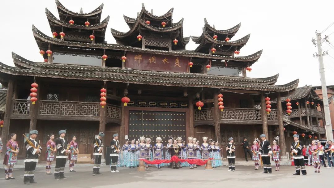 上午9點30分,在芭蕉林博園門口,侗族阿哥、阿妹身著侗族特色服裝,手拿侗帶、捧著香甜的米酒,吹起蘆笙,唱起侗族攔門歌、敬酒歌開啟侗族特有的開寨門儀式,喜迎八方來客。